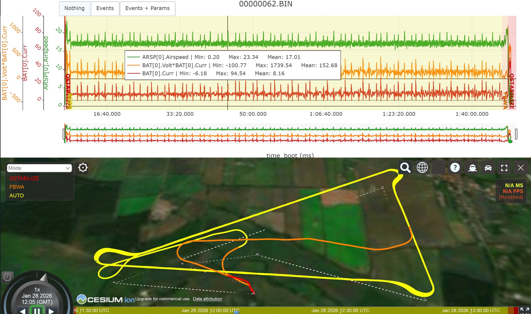 Hi Rolf. Thanks for the compliments on the plane. On the 100km flight, as it passed overhead, I could see that none of the props were in a favorable position. Previously, I did a ‘speed ramp up test. 1.5km legs and at each turn the speed was increased 1m/s. The power was measured during the straight legs and based on airspeed.