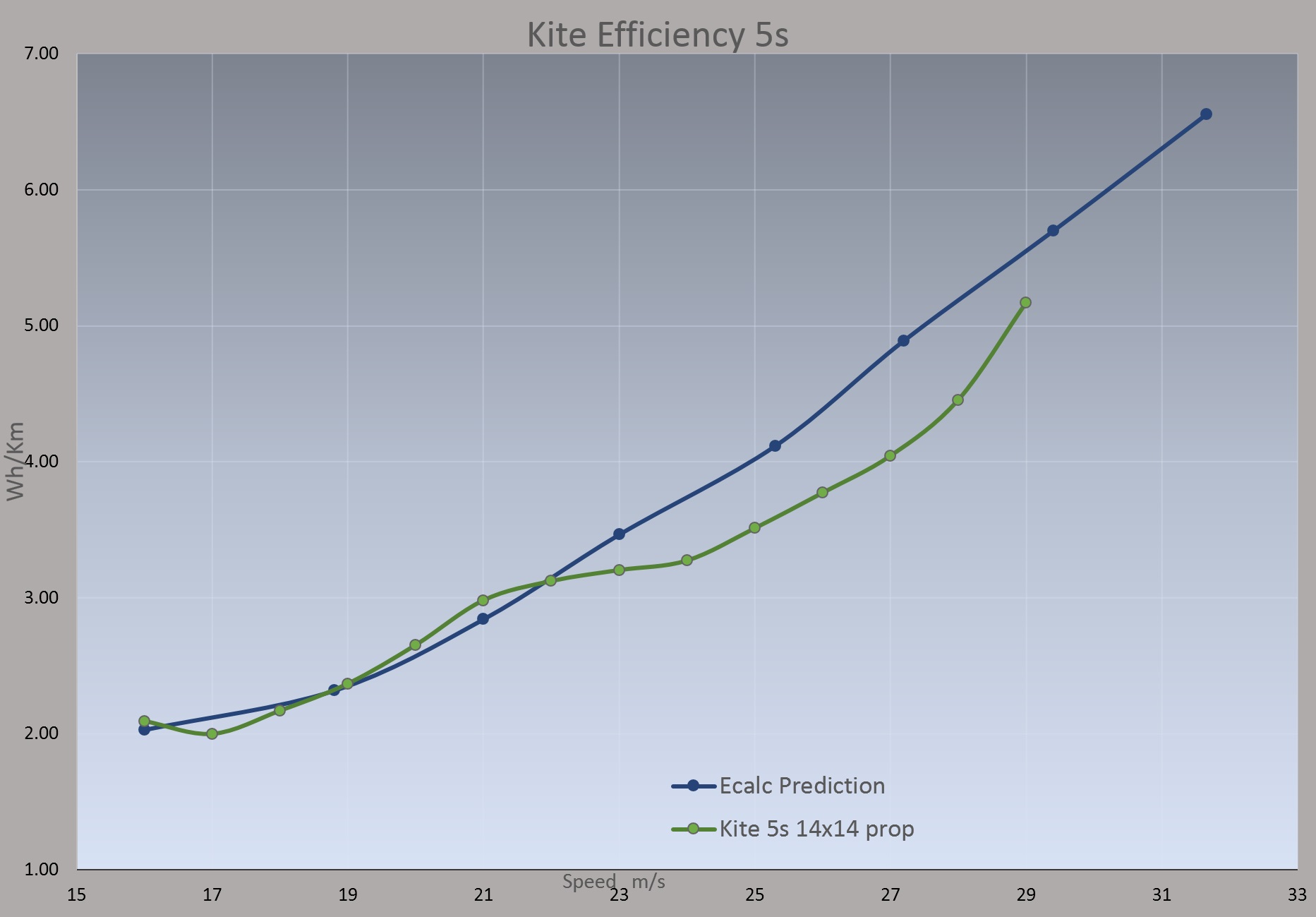 I also later did a 1 hour test in a large circle at 18m/s and the efficiency agreed exactly with the ramp up test. This 100km is a bit of a mystery. It was flown at 17m/s so efficiency should have been 2.0Wh/Km. Some of the efficiency loss is because of the 3 sharp turns on each lap and some probably because of unfavourable prop positions but I don’t believe those 2 things account for an efficiency that jumped to 2.5. There was a bit of dried mud on the drive prop. I will do more test flights