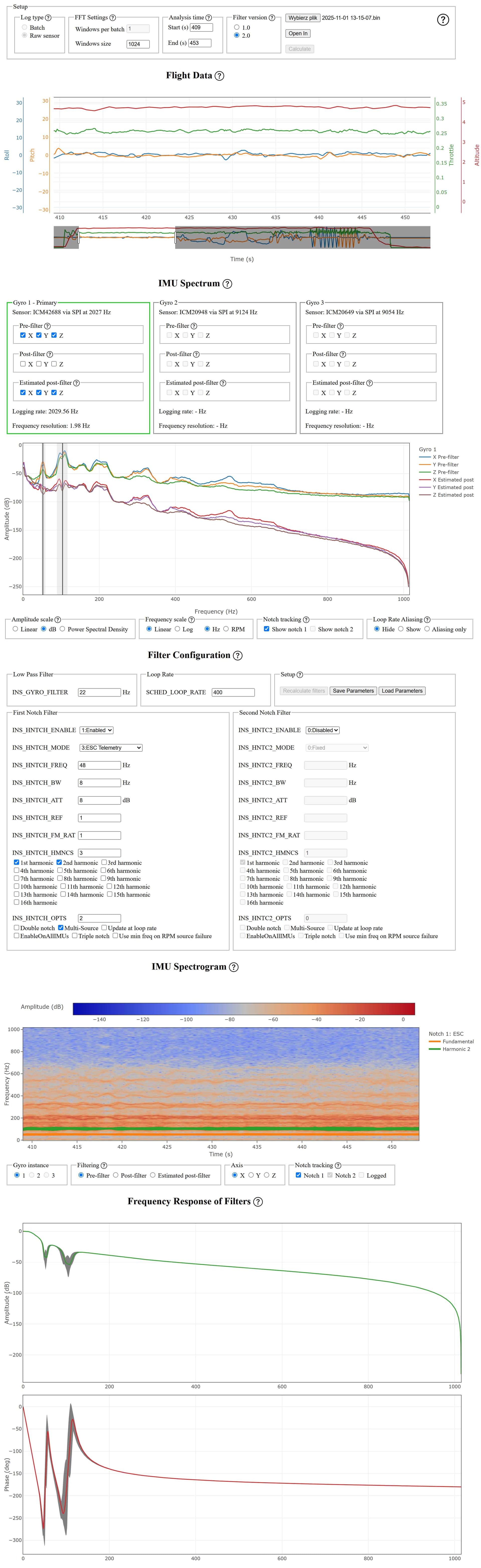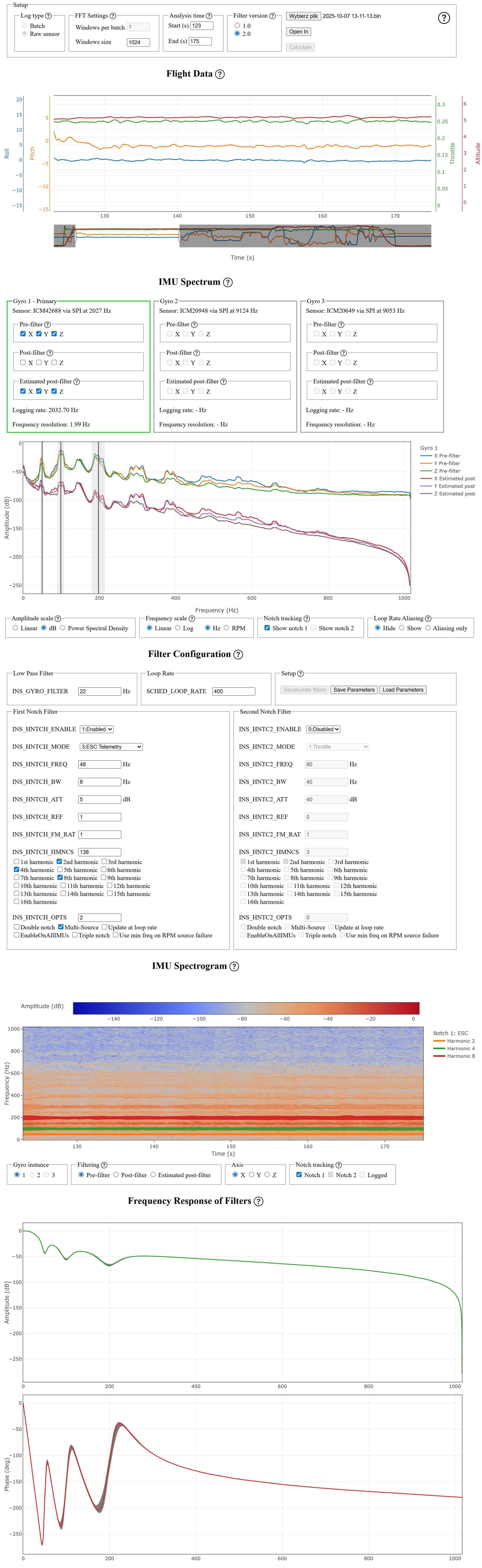 I performed a clean test flight with the hotch filter disabled and INS_RAW_LOG_OPT,9. I set the filter parameters based on ESC telemetry, but I don’t understand why I have to use every other harmonic frequency value. If I select 1 and 2, they overlap. Am I doing something wrong?