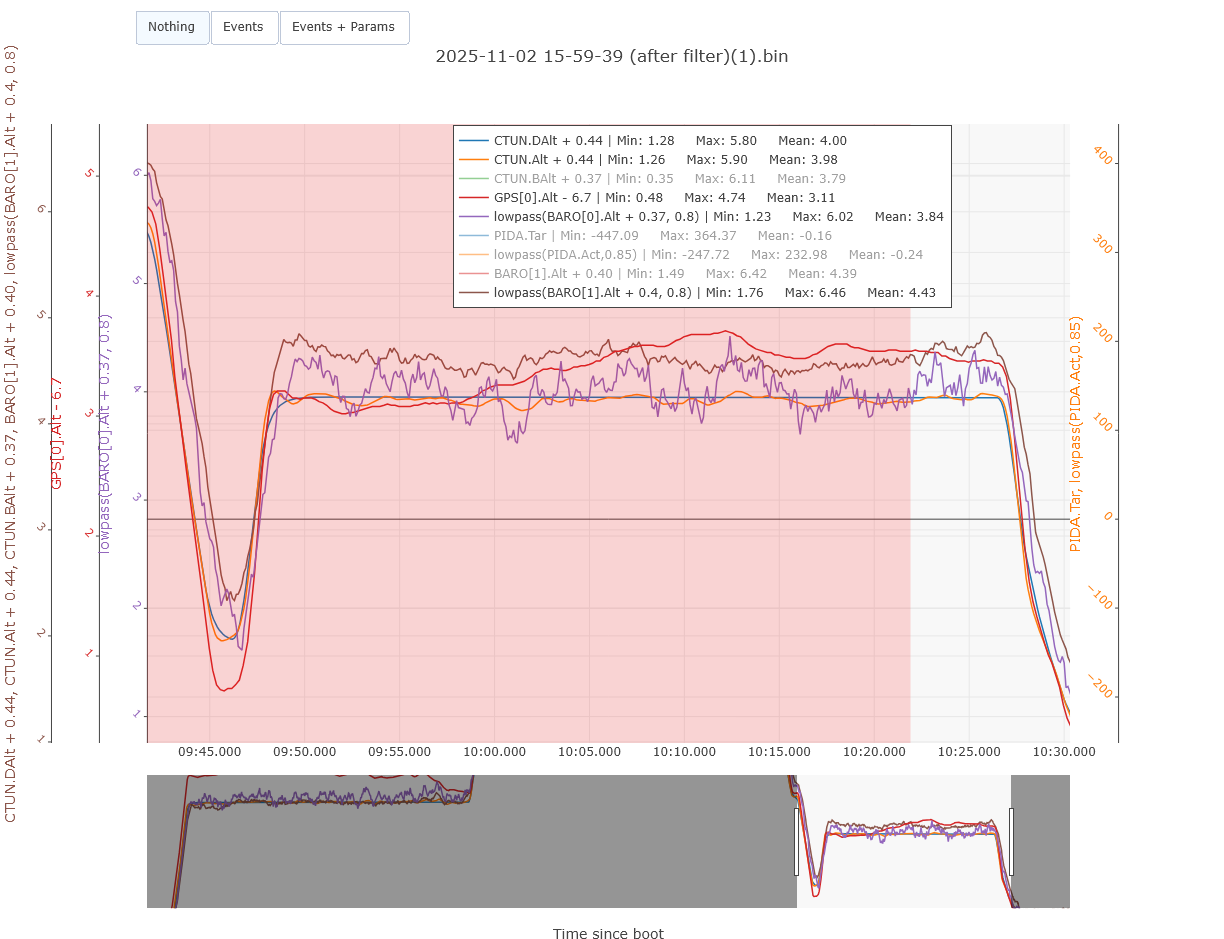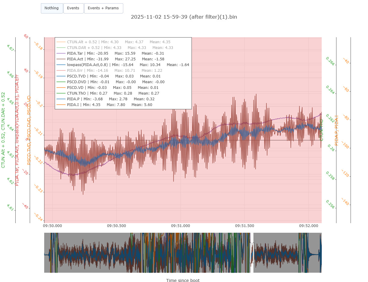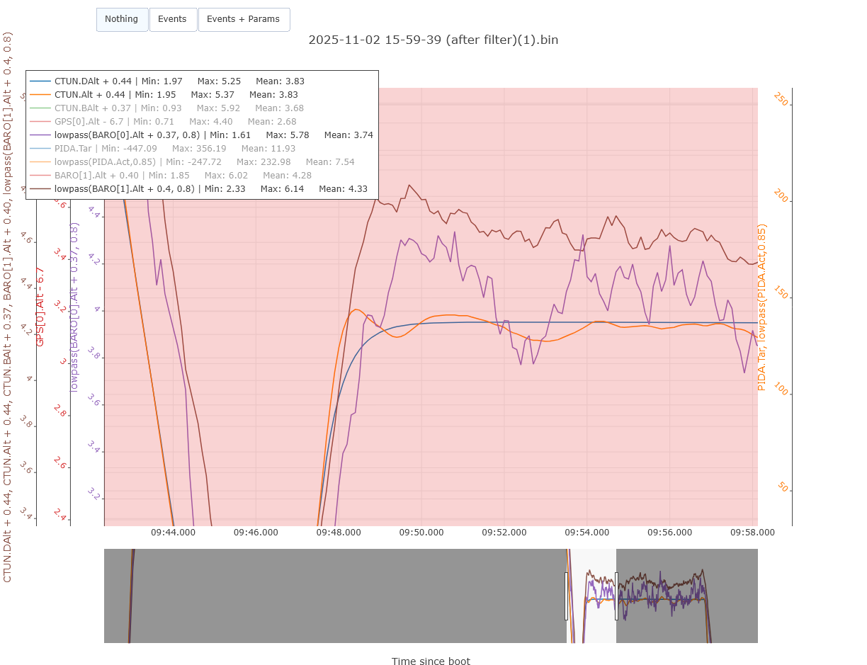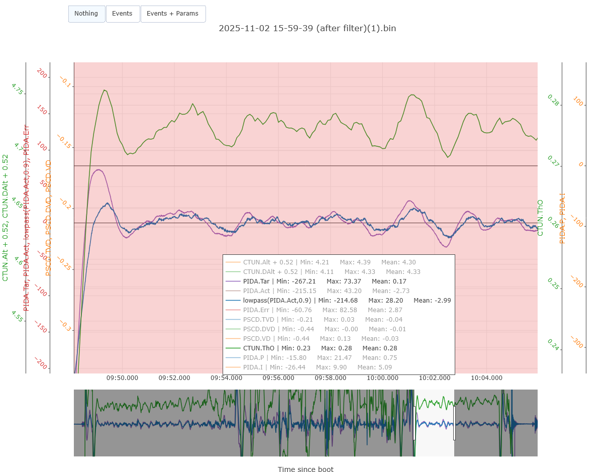 I couldn’t quickly find a part of the log where you were hovering without lateral movement for very long, but one of the slow sections it seems like vertical position control is a little less active when hovering. Higher speed maneuvers are a different story.