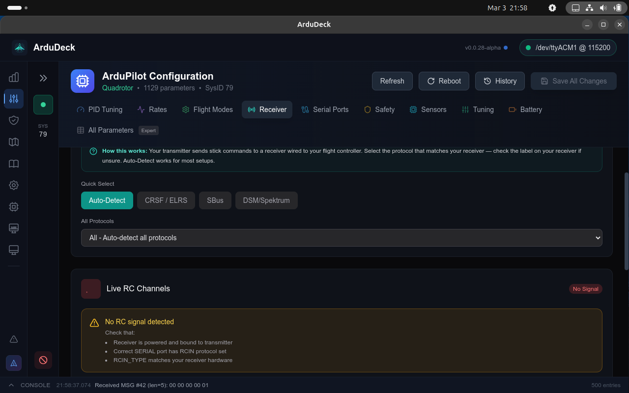 ArduDeck isn’t seeing the receiver. I’m using ELRS RC over Mavlink. It’s properly configured because it works when I check in Mission Planner. AD will detect switch changes when I make them on the radio. it just doesn’t see the sticks so I can’t try out the calibration.