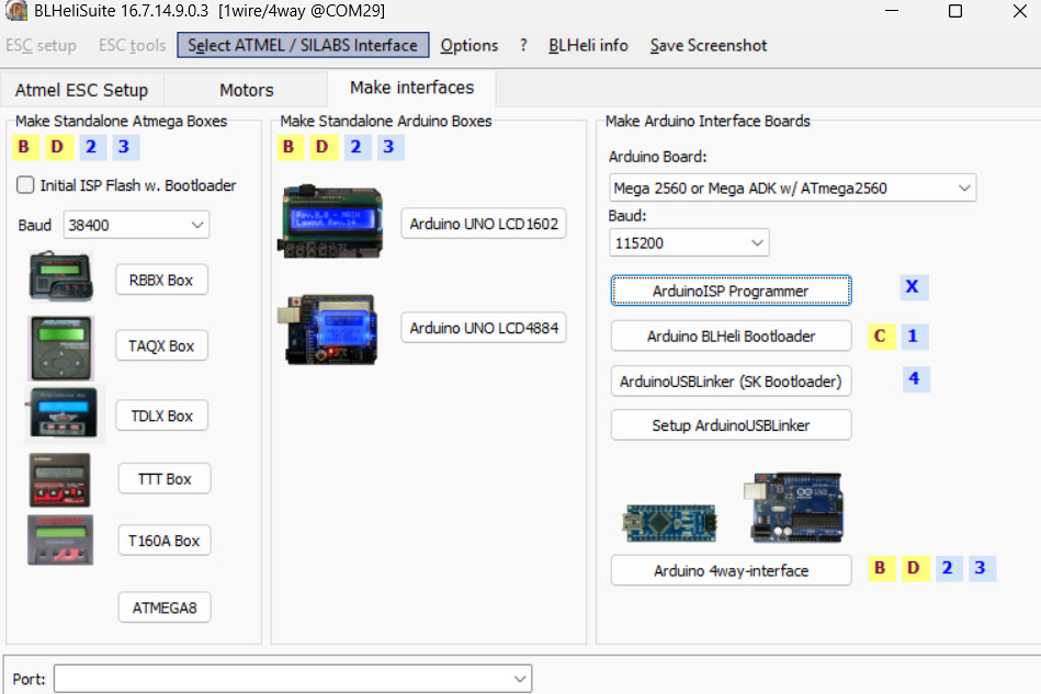 Can you try all interfaces? If all else fails, you can still try to connect them using an Arduino. I currently don’t have the BLHeli Suite installed, so I don’t remember exactly which interface worked for me