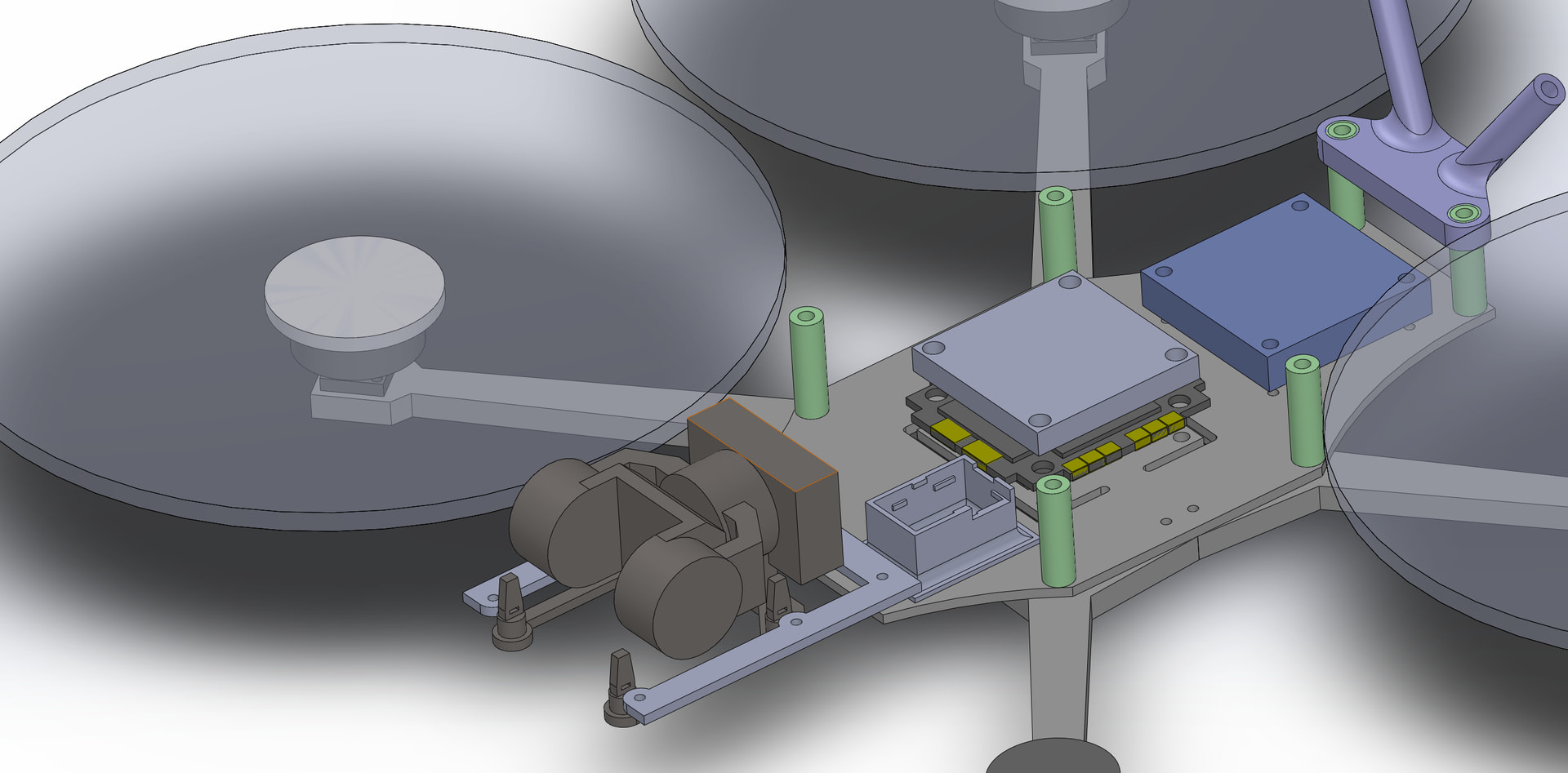 I’ve used the one axis version of this gimbal before and it seems to work with a simple rigid direct mount to the air frame as well, so I could do away with the booms and anti-vibration mounts.