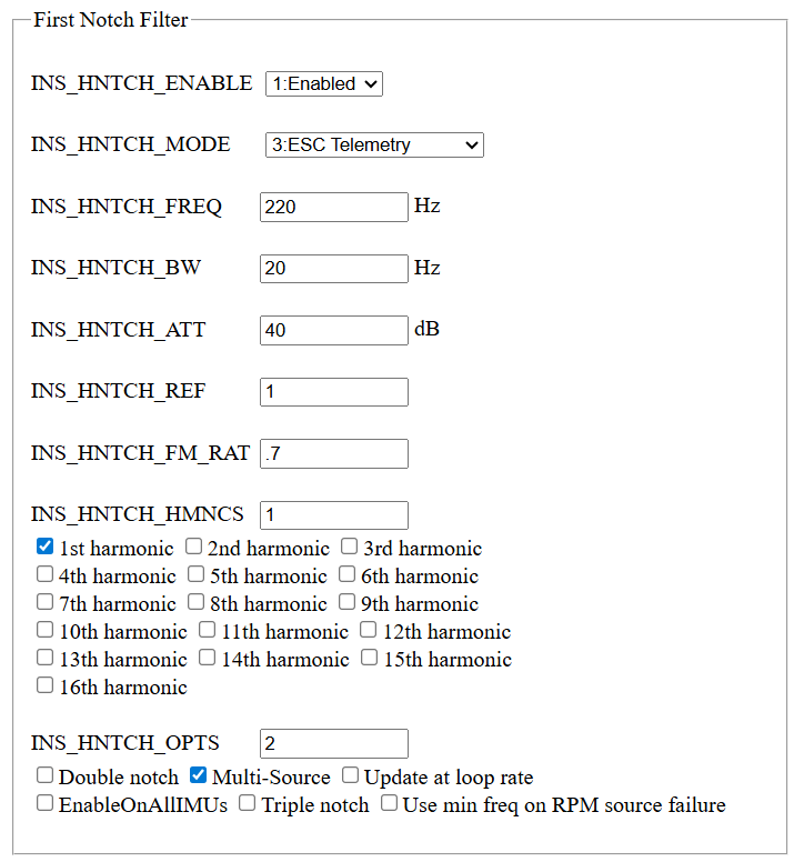 Understand those filter settings would be a band-aid but other than the 220 where did you come up with the BW and ATT numbers and you choose INS_HNTCH_OPTS 2 (multi-source) so it track each motor correct?