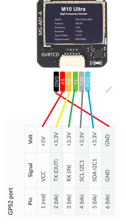 I am trying to connect a MicoAir M10G-5883 GPS unit to my CubeOrange Flight controller, however I get no connetion to neither the GPS nor the integrated Compass unit. I triple checked the connection (RX→Tx & Tx→ RX as well as SDA and SCA connected). The GPS powers on with a blue light, so it should have correct power. I plugged it into GPS2 port and configured Serial 4 for a GPS Receiver with auto discovery on (I also configured the other Ports to be GPS ports, just to be safe, but no luck). But neither GPS (GPS: No GPS) nor the magnetometer (does not turn up in list of magnetometers in configuration screen) appears.