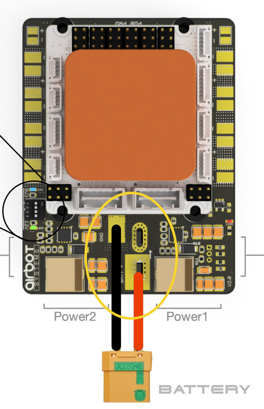 The battery positive and negative (and nothing else) should be connected to the large input pads of the power distribution board. All speed controllers and every other accessory should be connected to the smaller output pads on the sides of the power distribution board.