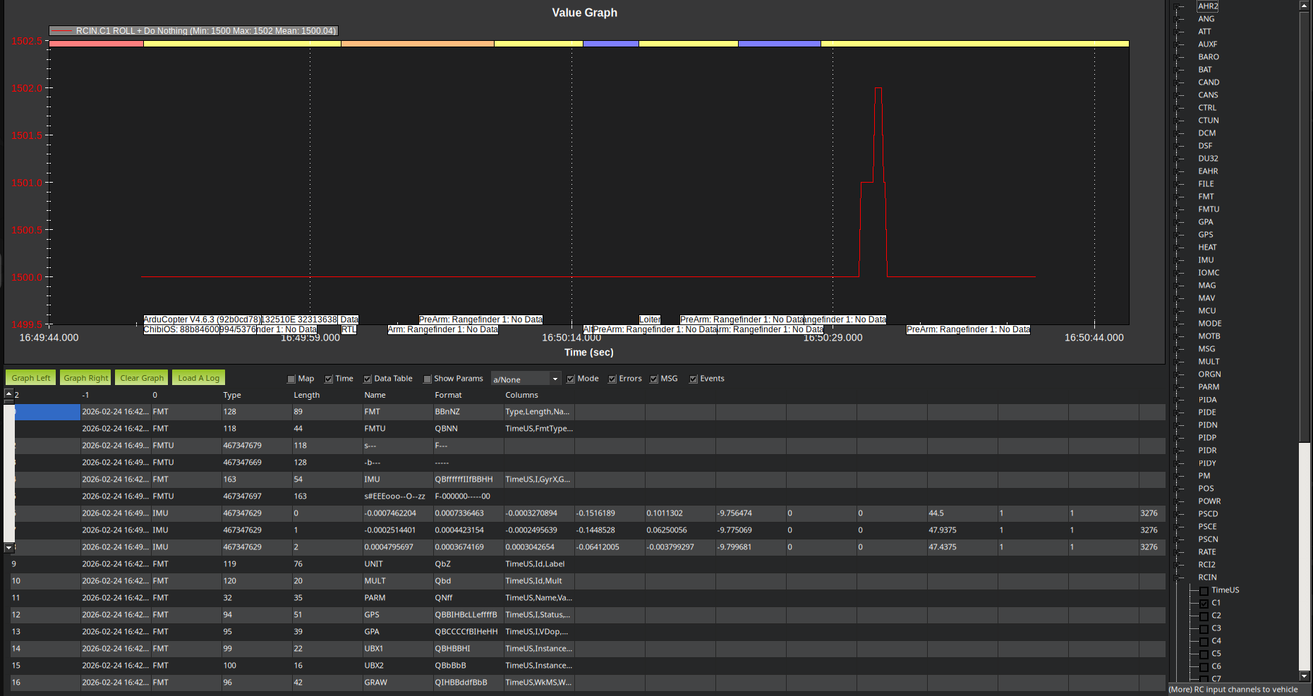 For some reason there are no ARM messages in the log. Also all of the RCOU channels are set to 0 so not sure how motors are spinning, unless you’re using CAN ESCs? There’s no current spike at all either to indicate the motors being on. CTUN.THo (Throttle out) is also set to 0 throughout the entire log.