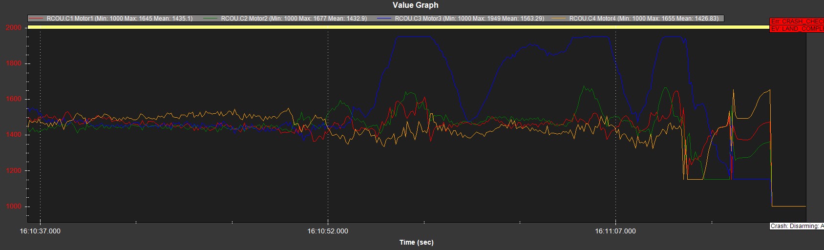 In Log 7, motor 1 had the same intermittent issues. Either way, the crashes are a mechanical problem, not a software issue. Check power distribution, prop mounting, wire harnesses.
