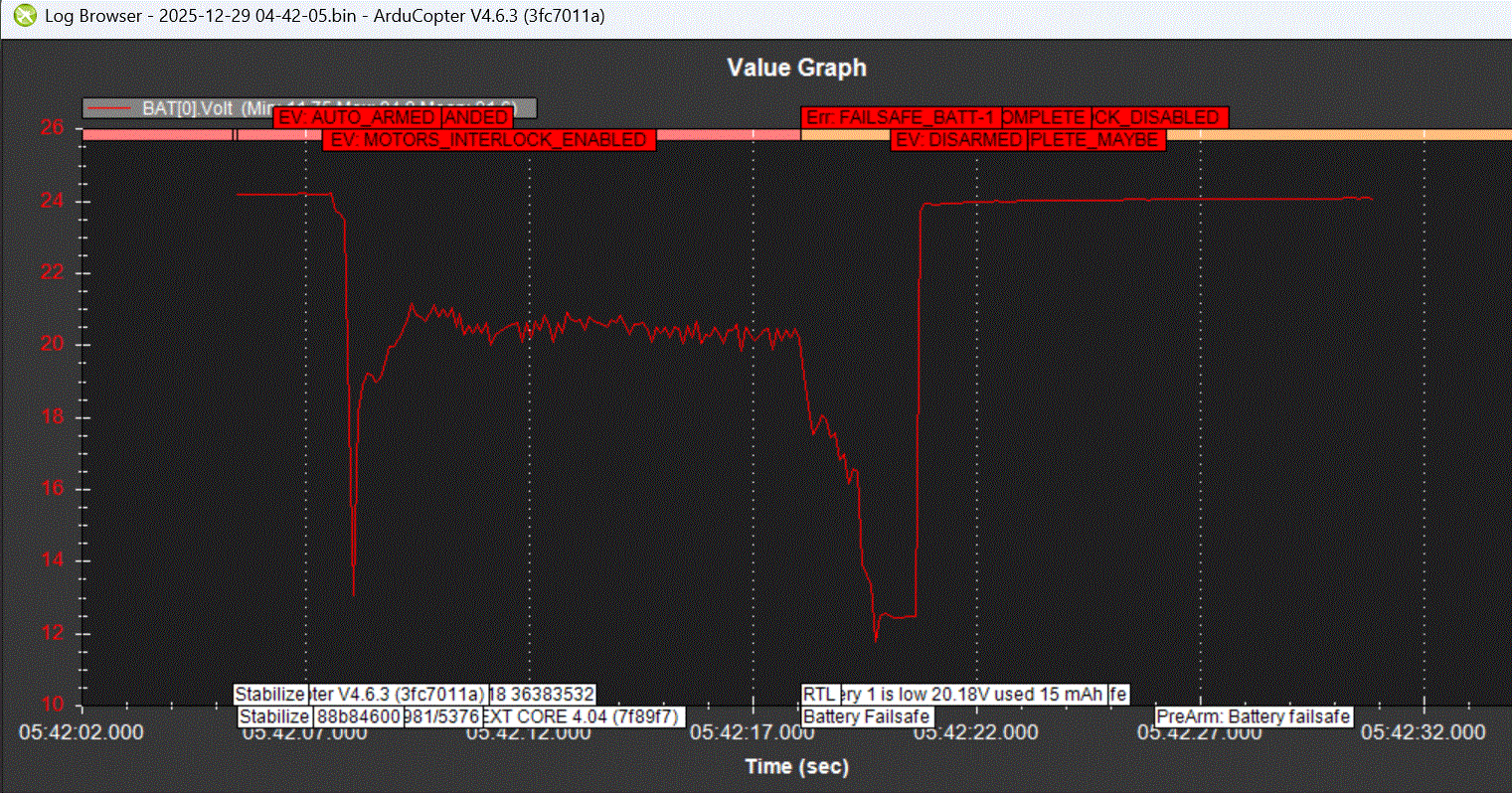 I charged it from 22.8V to 24.8V and took the aircraft out to the field. Power up was normal and armed okay after GPS lock. Takeoff was smooth and I was trying to get it to hover in Stabilize mode, but after about ten seconds and sank and landed. After taking it back home and revieing the log, I saw that the voltage dropped from 24.8 down to and below 19V which caused the battery failsafe to trigger: