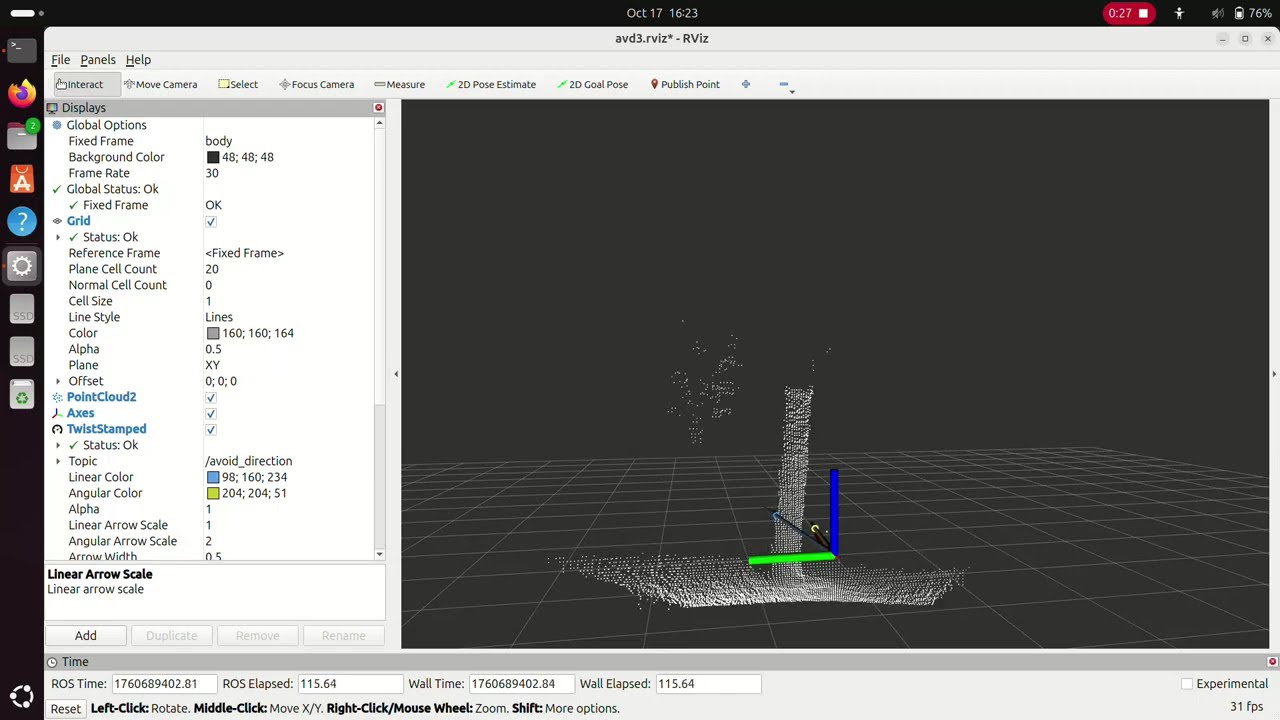 The planner continuously generates a safe navigation direction that is as close as possible to the target direction, and sends it to the flight controller as the SET_POSITION_TARGET_LOCAL_NED MAVLink message. In the video, the short arrow indicates the target direction, while the long arrow represents the safe direction generated by the 3DVFH algorithm.