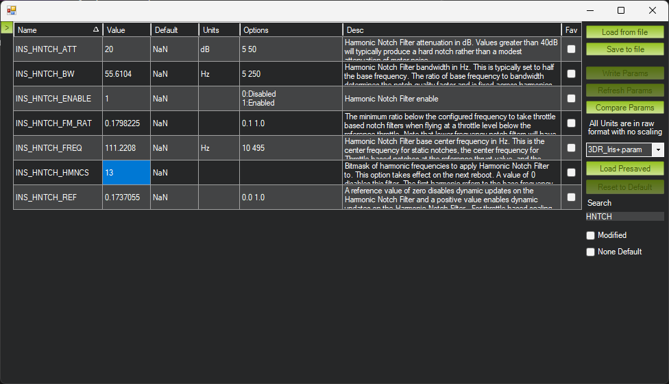 It also set INS_HNTCH_HMNC=13 automatically. (It was originally set to 7/1,2,3 harmonics before disabling the notch and running the FFT)