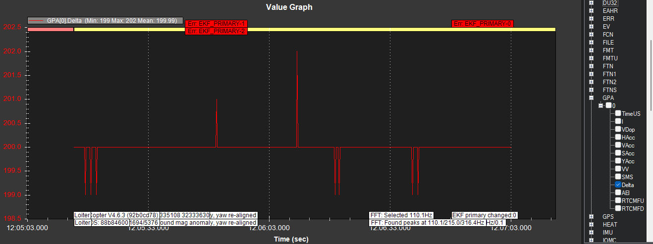 When flying in loiter, I then activated FFT Tune using the AUX switch. But I got the following logs/errors: