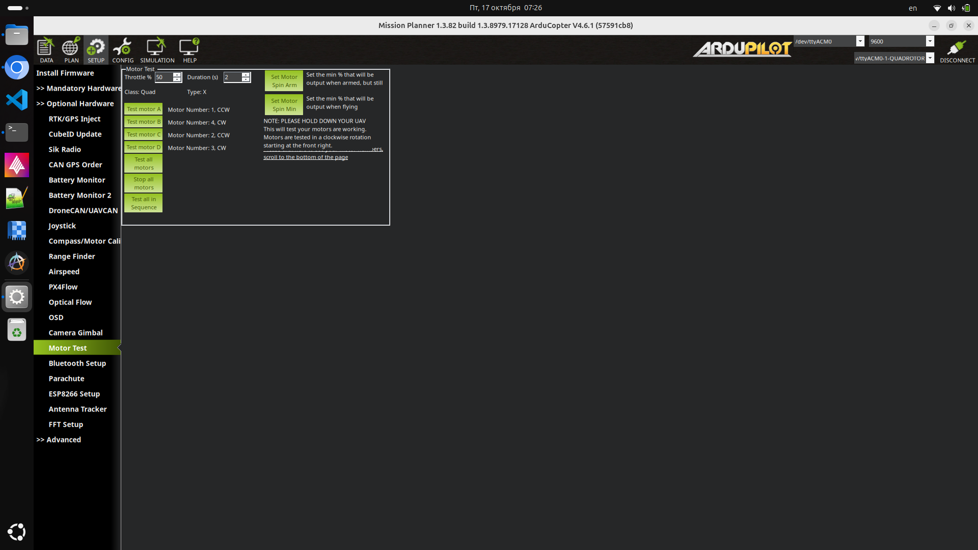Dave, could you please elaborate what do imply by asking ti use test motors feature first? I want to emphasize that FC gives less thurst on the one of the motors which it doesn’t allow to get it up vertically – it wasn’t an issue on the first two test launches.