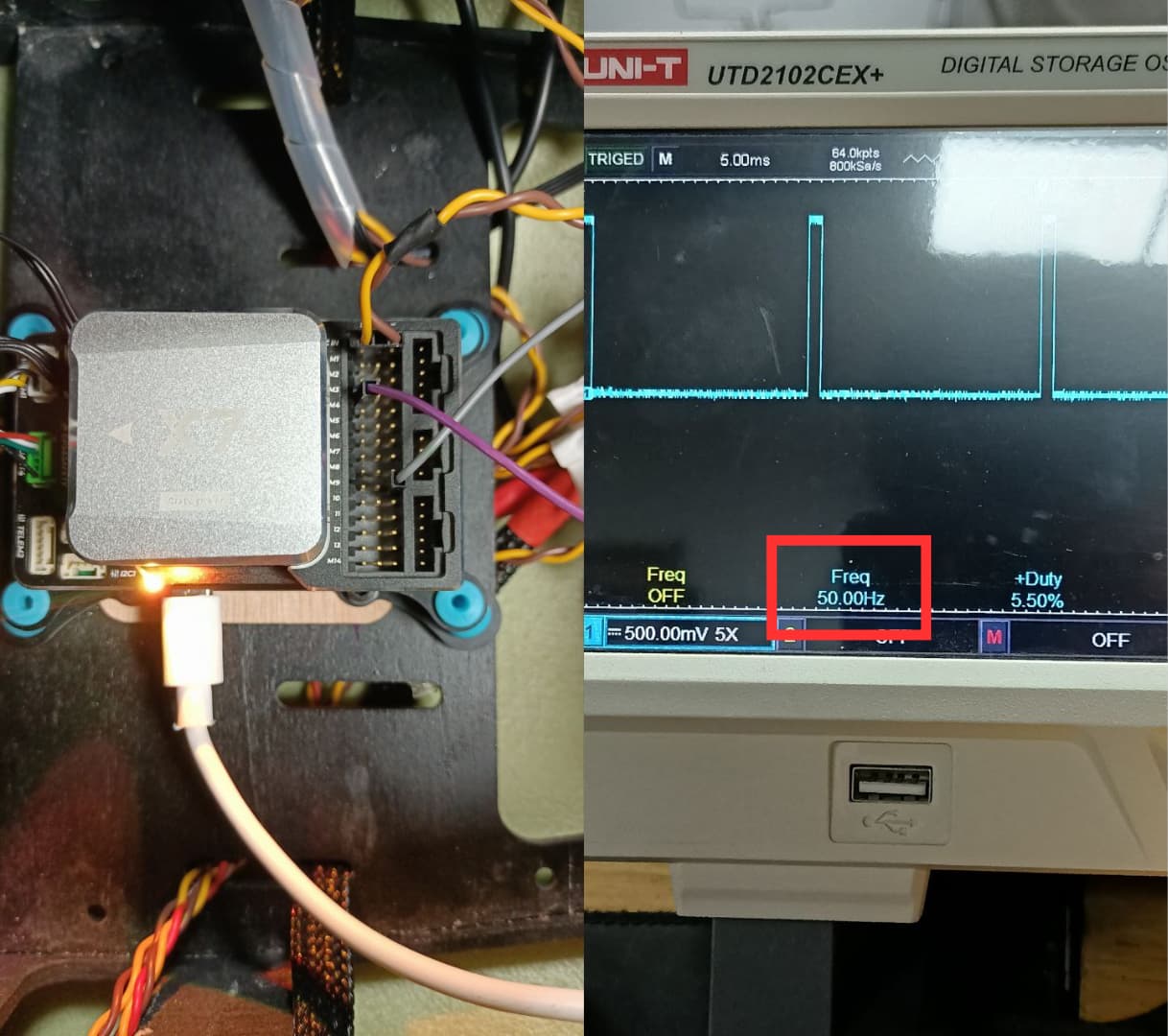 I connected an oscilloscope to check the servo outputs, and found that all pins output 50 Hz, except M5–M8, which are 400 Hz.