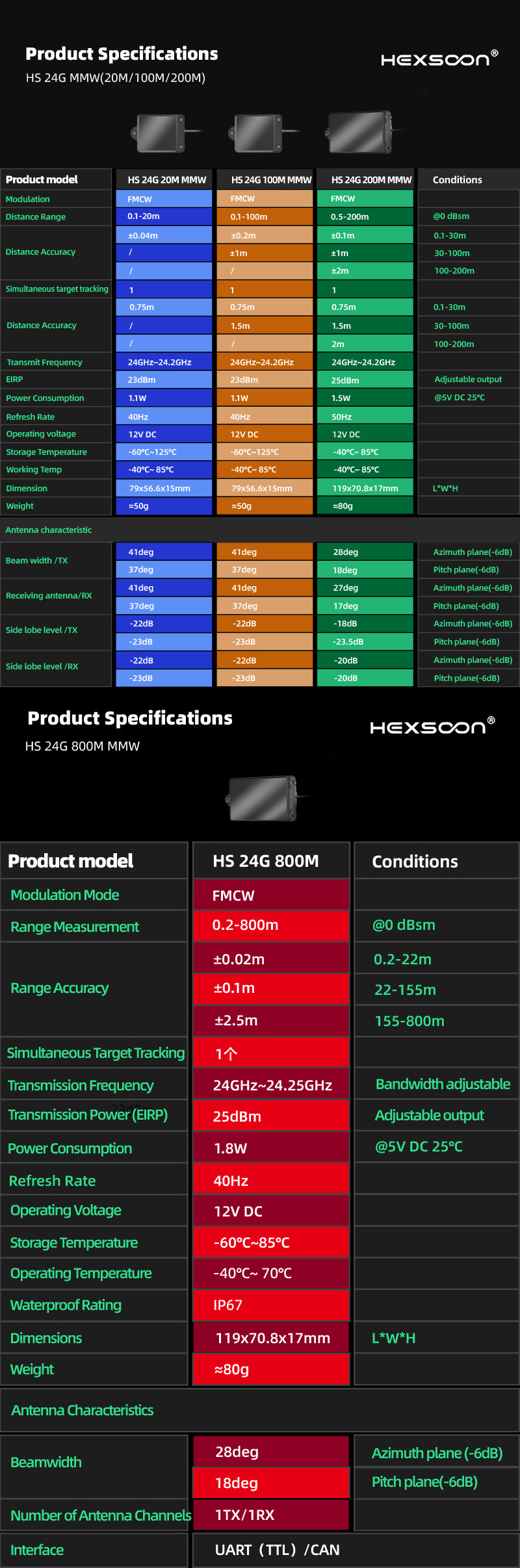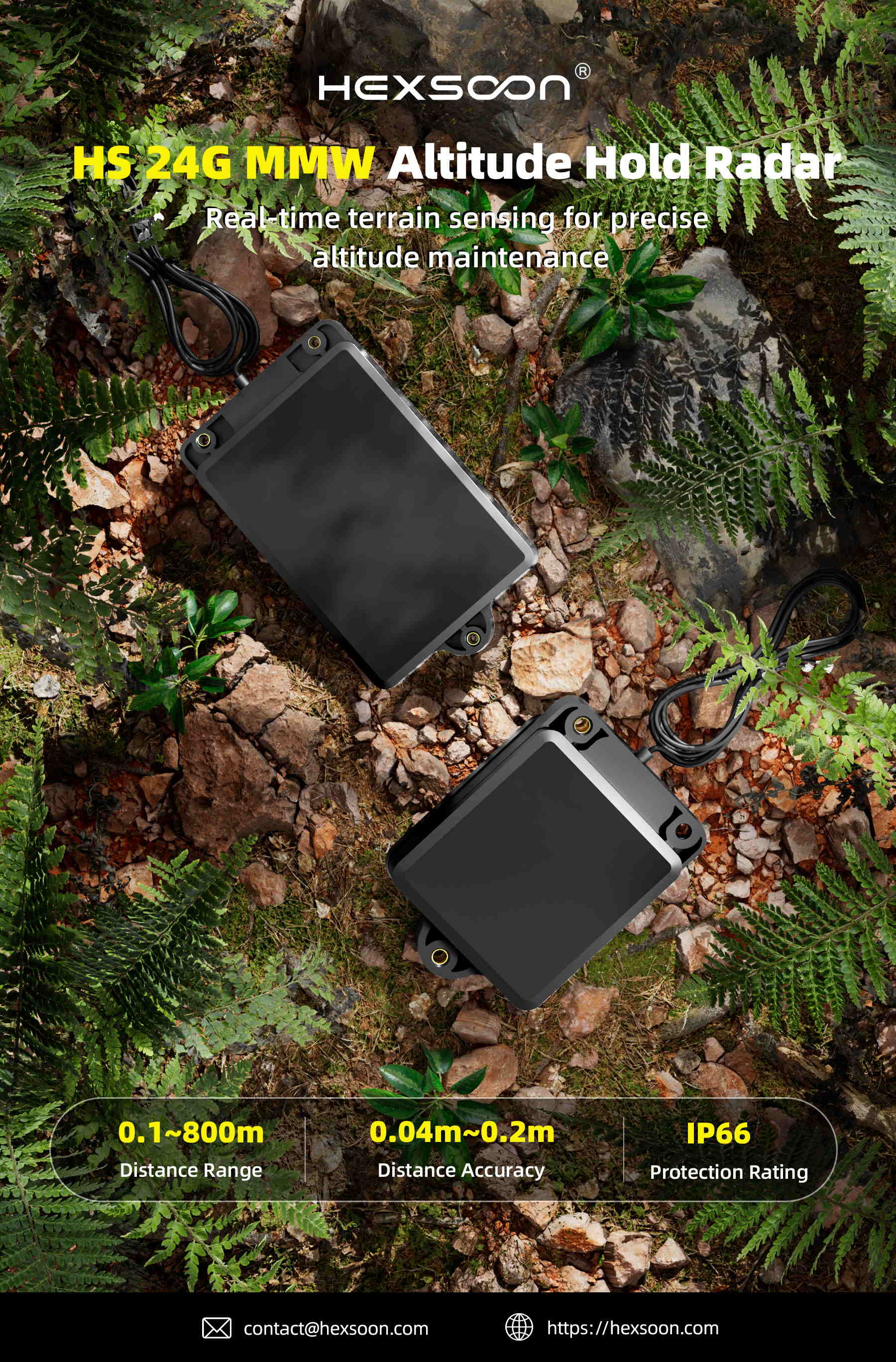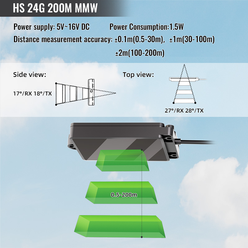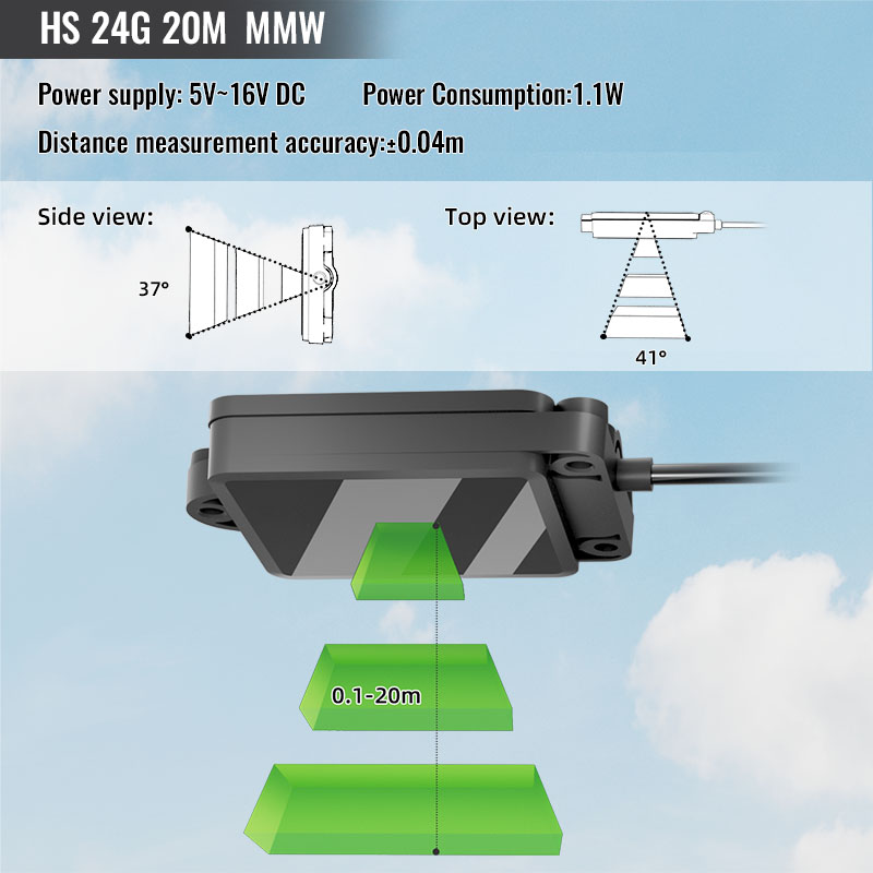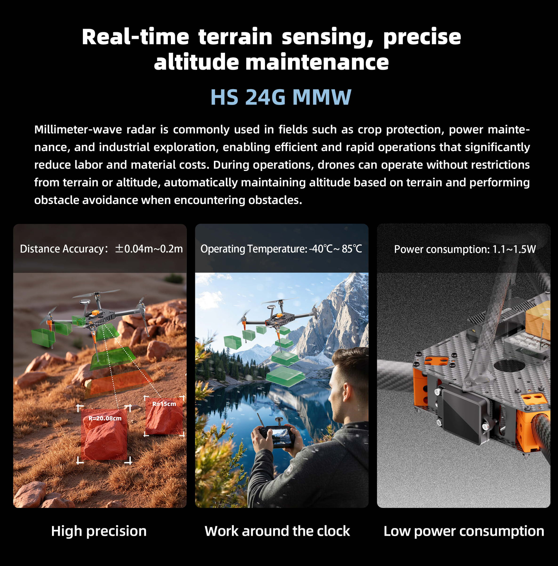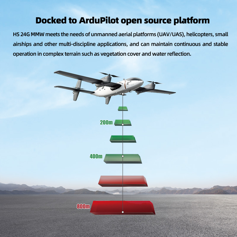 HS 24G MMW Millimeter-Wave Radar — Real-time terrain sensing for accurate altitude maintenance. Continuously measures ground elevation to ensure stable drone flight over complex terrain.
