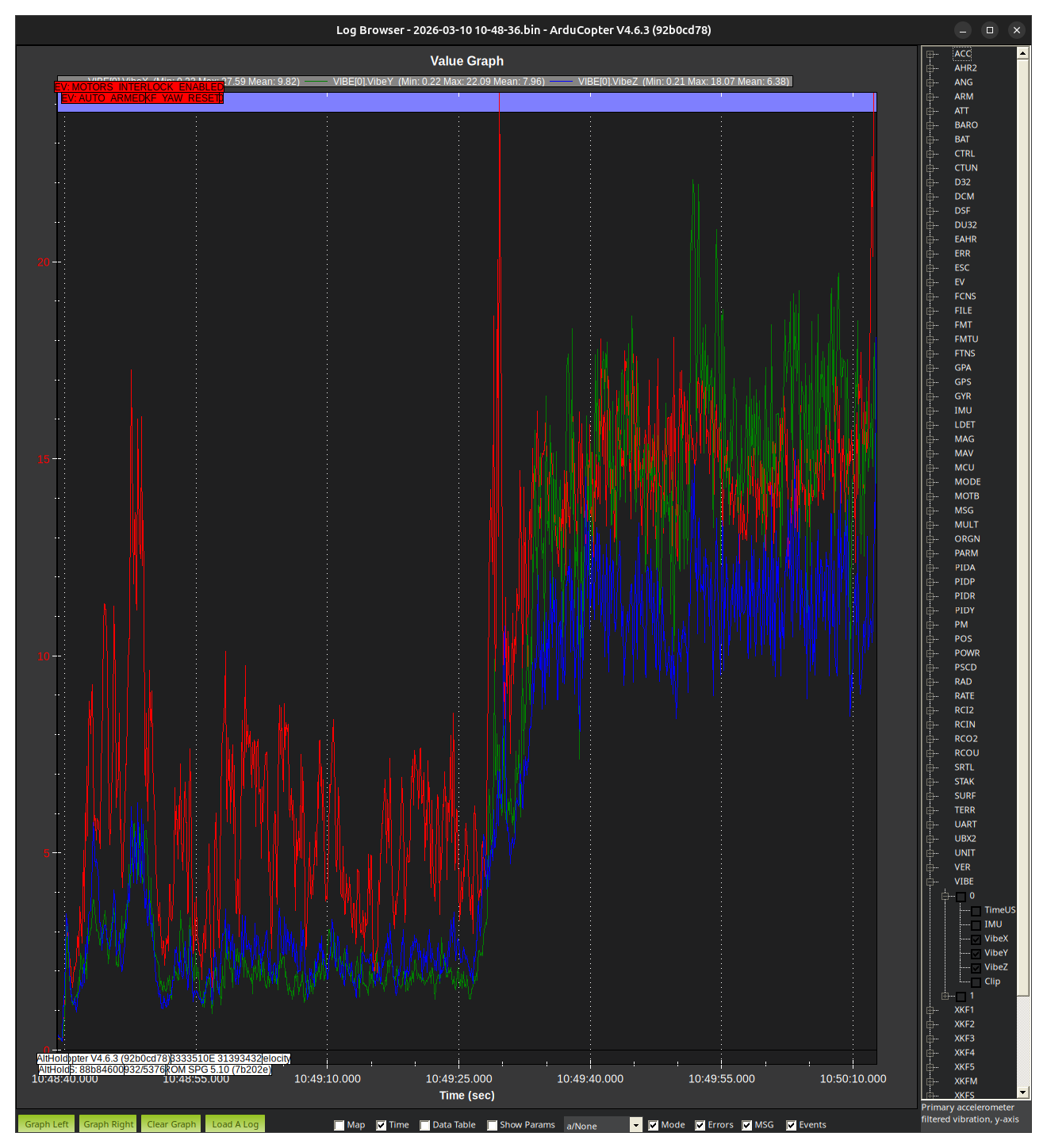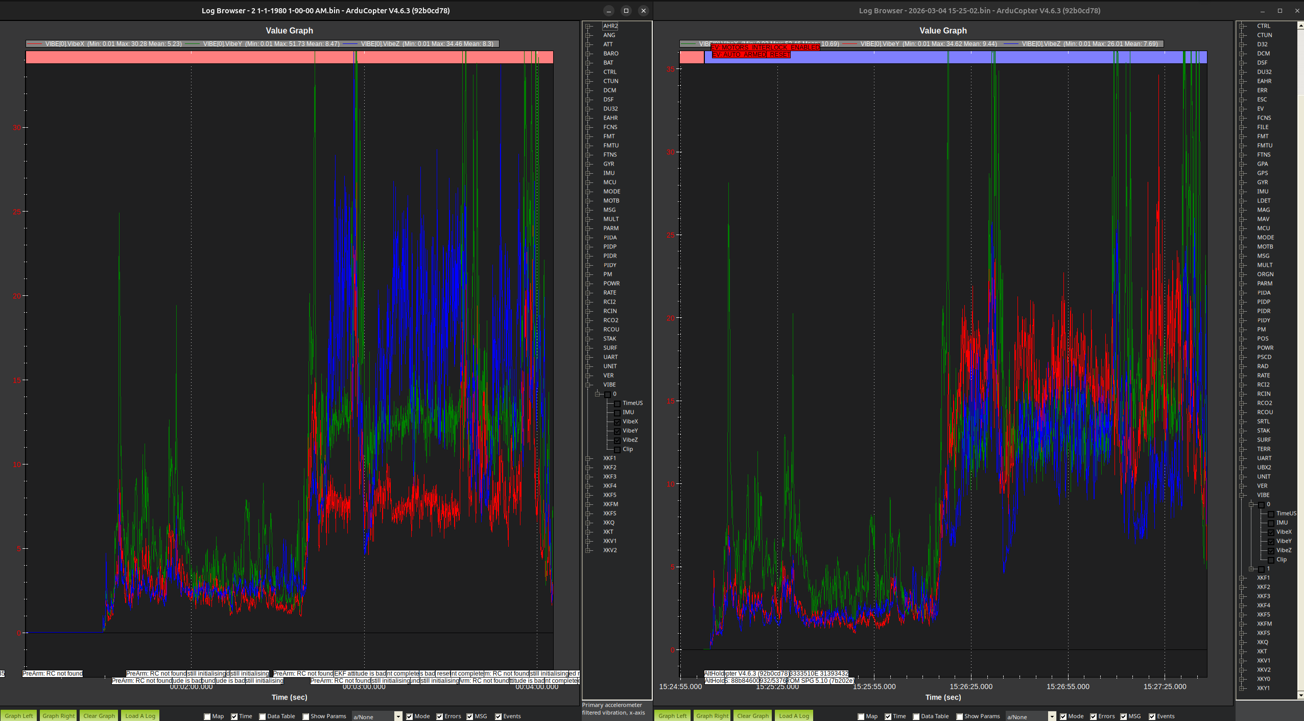 I attached a second flight controller in a hard mounted wind insulated container below the quadcopter, it’s the same flight controller model (h743 slimv4), but without any GNSS/RC, so it timestamps at 1-1-1980 as expected. I don’t see any significant vibration differences though.
