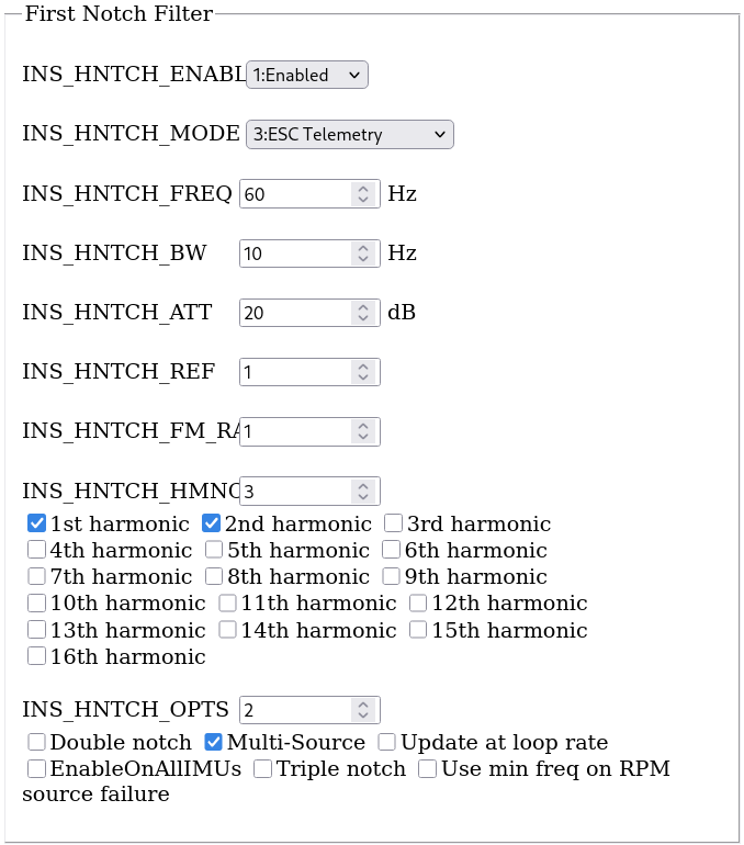 When you hover and autotune, the machine looks very fine and smooth. When you fly for real, props start spinning faster, ESC notches stop covering frame resonances and they hit you hard through control loop feedback. With one such machine, I am currently living with four notch filters, first being ESC-based, others fixed and meticulously configured (e.g. freq 42.5, harmonic mask 80) to cover about 8 different resonance frequencies.