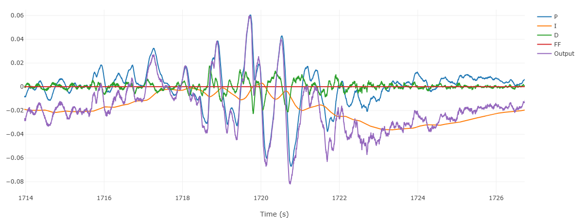 Visually, the quad slowed down as it approached the perimeter of the circle, it began oscillating as it slowed (most noticeable in roll), and continued to oscillate whilst it was ‘paused’ hovering at this point. Then, once it began tracing the perimeter of the circle, the oscillation subsided and the rest of the flight felt fine again.