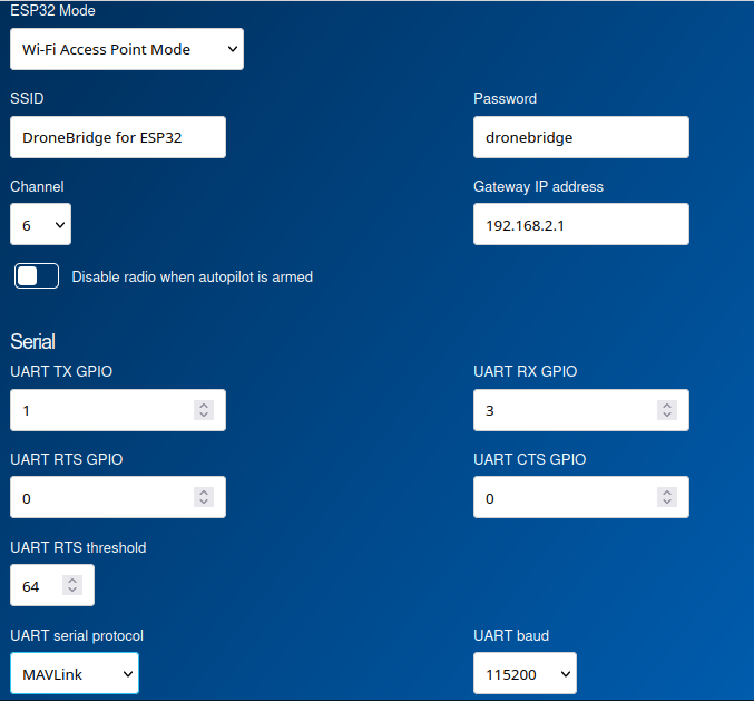 I have this ESP32 on the drone to which I intend to connect over WiFi from my PC and I configured the following parameters: