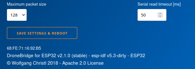 I’ve flashed a NODEMCU-32 with dronebridge (v2.1.0 stable). This is the pinout: