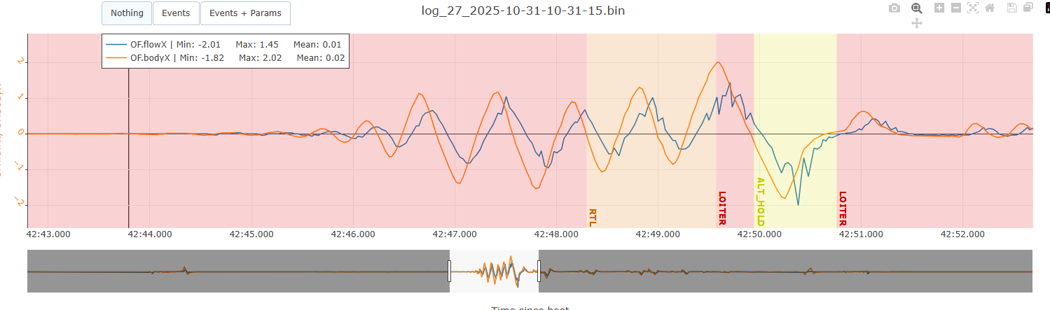 The Jetson reports its time to compute the optical flow as 22ms. The logs show OF.flowX lags behind OF.bodyX by about 250ms.