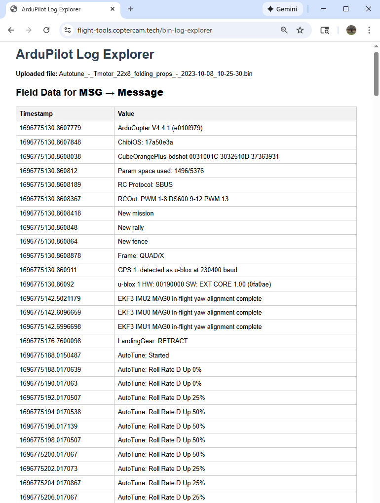 My “log explorer” scripts make it easy to look around the data - by allowing the user to drill down by message type and field. One handy use of this is the ability to report all the mavlink messages for a flight.