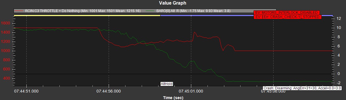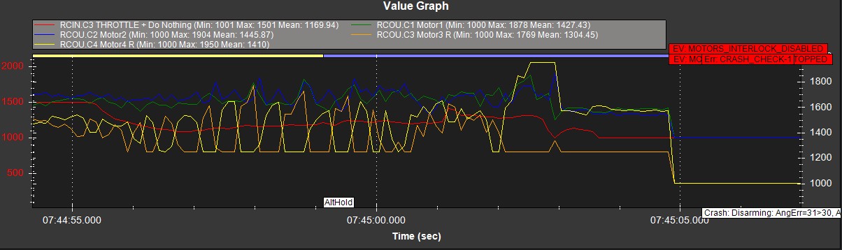 Note here as you are descending, before you switched to AltHold which had nothing to do with the problem, the motor outputs are bouncing off of the very high Minimum Spin you have configured. Stability is lost under this situation and down it goes to a crash.