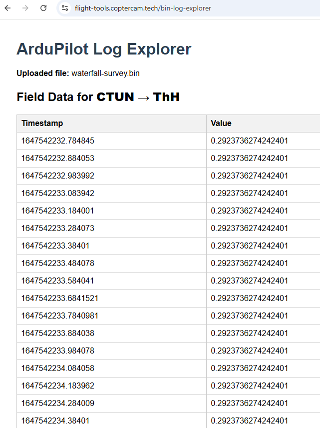Online access to this script is at: https://flight-tools.coptercam.tech/bin-log-explorer