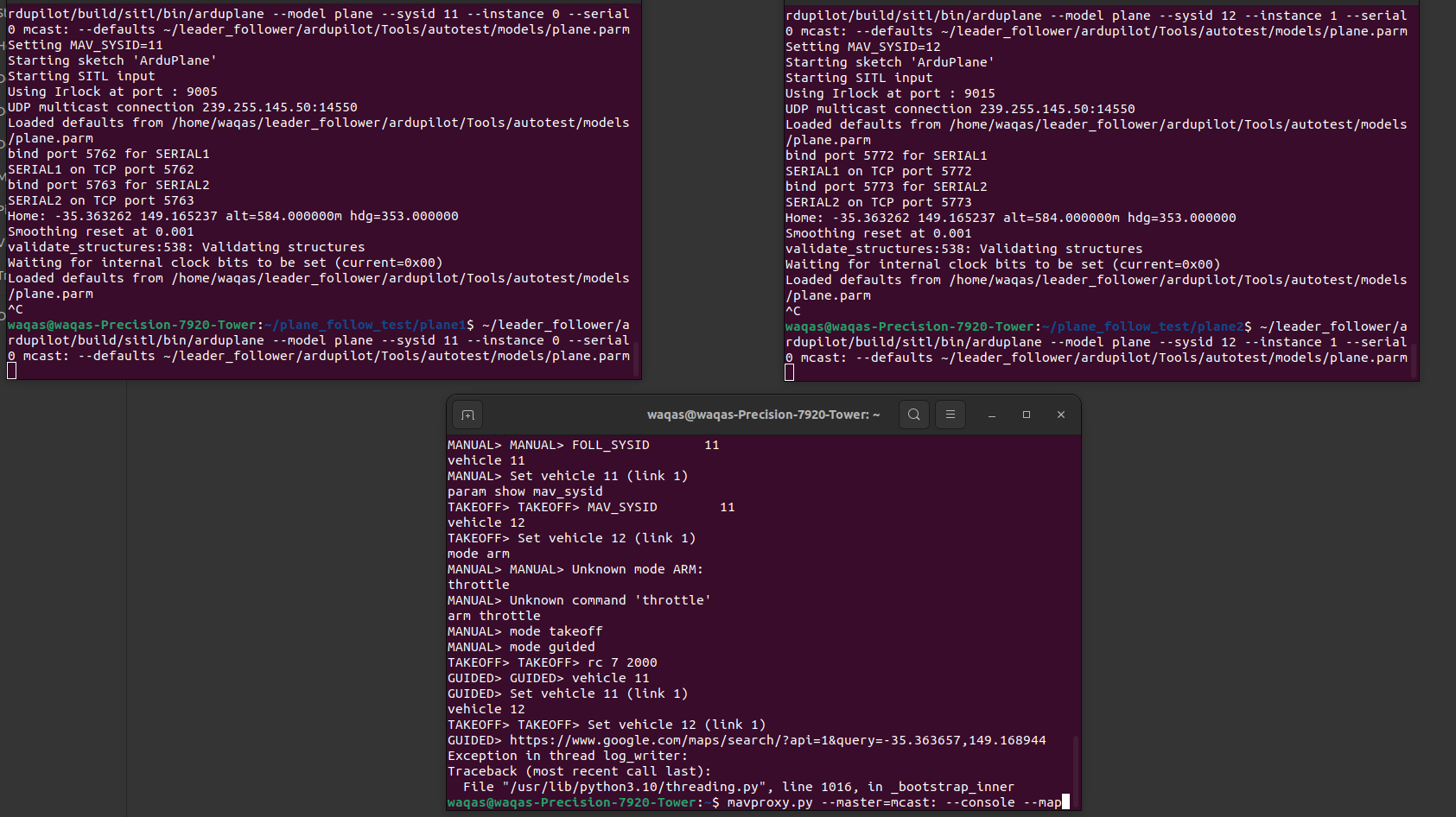 Then I have a. “master” script that starts the 2 planes and runs mavproxy. Something like this: