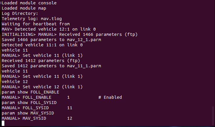 Once you have the two vehicles running you can switch between them using mavproxy using the “vehicle” command … “vehicle 11”, “vehicle12” … where the 11 and12 are the MAV_SYSID of the vehicle to connect to.