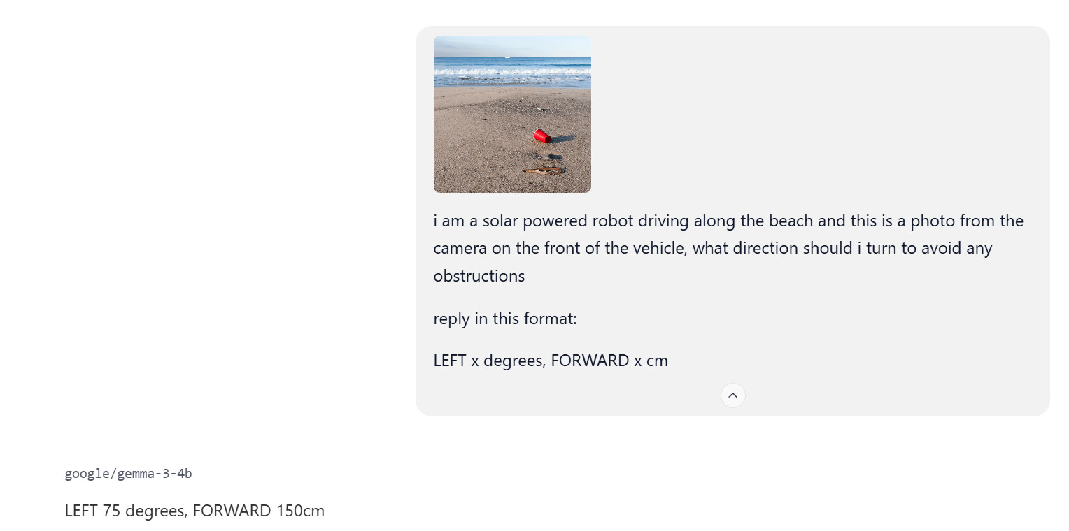 I have been experimenting with different vision llms to see what was the smallest model to give a reasonable answer. I’m thinking for just asking “are there any obstructions ahead” while on the move i can use a small fast model like gemma2 4b but for if something is detected and I need more detailed analysis and navigation I can use one of the larger 12B or 27B models.
