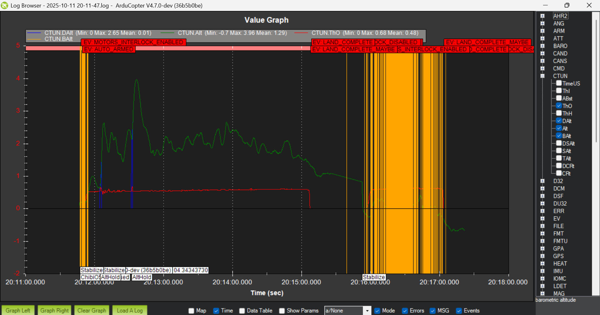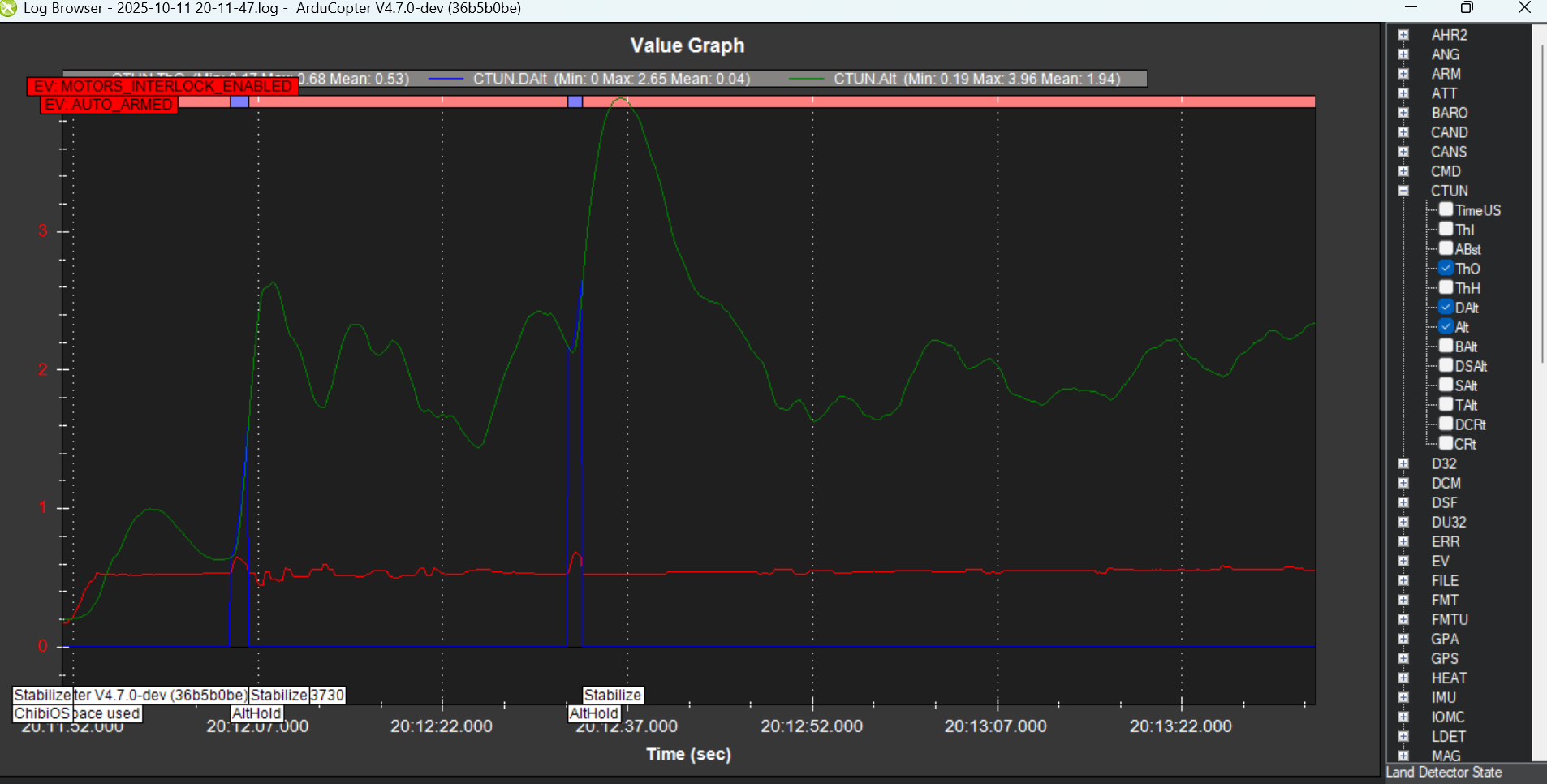 The following snapshot corresponds to stable Altmode switch in OctaQuad-X configuration with older build V4.5.7. Here CTUN’s alt and CTUN’s Balt are in line and CTUN’s DAlt switches to flying altitude the moment AltHold is enabled