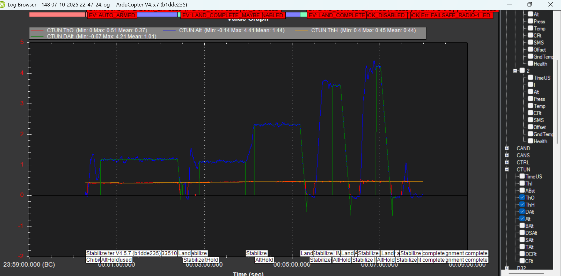 Whereas CTUN BAlt is 6 order of mangitude higher and when FlightMode is switched from Stablize to AltHold. DAlt is lineary increasing may to catch with with CTUN’s BAlt. What could be the issue. Also with this build have enabled TF02 RangeFinder and RPLidar A2M12 and hence Parameters changes related to enable and read relevant values have been changed. Can this Cause CTUN BAlt’s reading to be so high.
