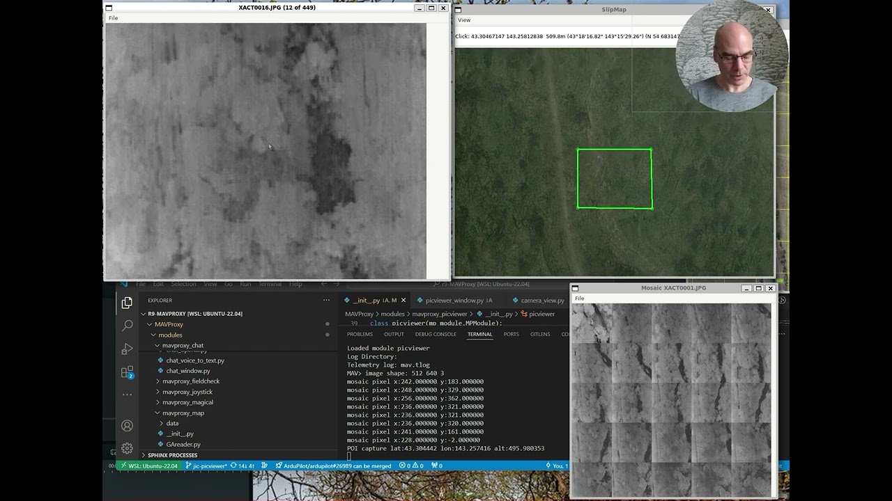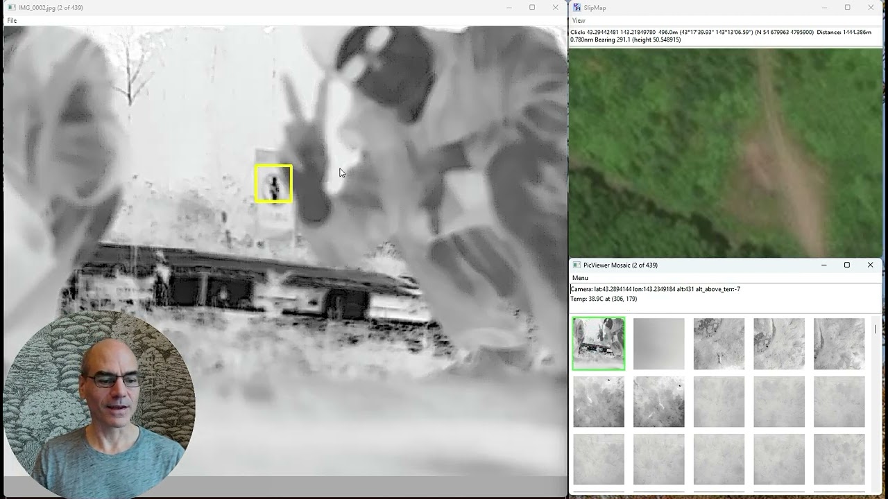 We developed a new MAV Pic Viewer application to allow us to quickly review the hundreds of images we collected on each flight. Below is a video of the tool as it was being developed. It’s been improved greatly since then and will be released as part of the next MAVProxy release. The final version supports sorting the images by maximum temperature which made finding the mannequins relatively easy because they normally appeared within the first 10 images.