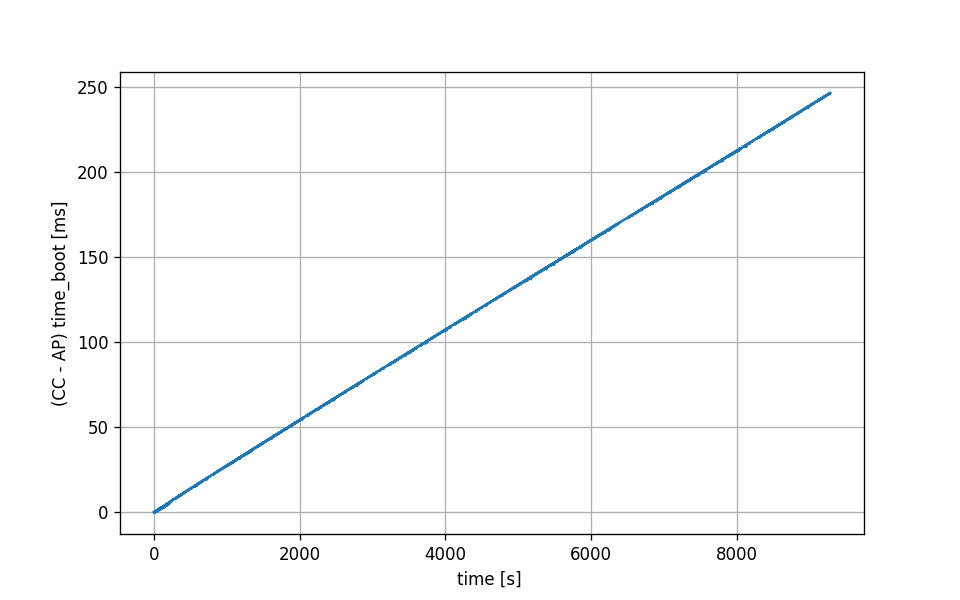 I noticed a shift between the CC and the AP system clocks, but this is not something unexpected. It is approximately 100 ms/h. What is interesting to me is that the shift between the two system is linearly increasing without jumps, that means that none of the two system clocks are adjusted to GPS time or network time during the recording interval.