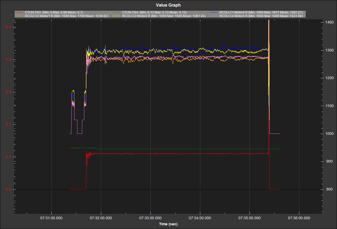 For comparison, I also checked the ESC.err logs from the bench tests where a motor did not spin. I am not 100% sure I am looking at the right / most representative logfile because there are a lot… but I can see ECS.err spikes on ESC 1 and 3, both in the 0.05 and 0.03 range. So nothing significantly diffferent if compared to the flying configuration.