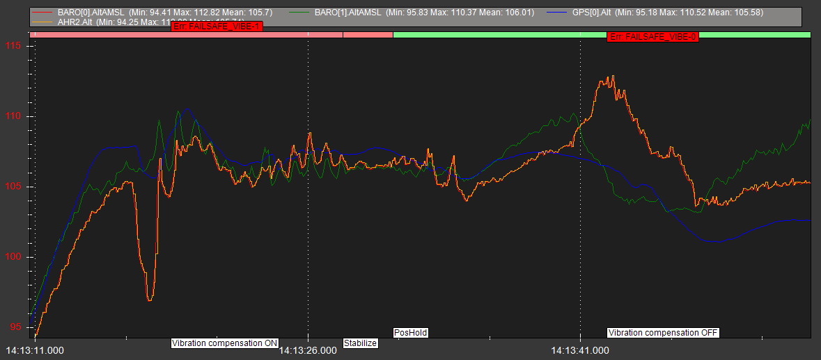 I think this is mostly the culprit, when the baro reading dipped the vibration compensation was triggered. Strange is it was the baro0, which I assume is from the FC. I though the tail baro would give worse reading since it may got dirty air from the frame when cruising.