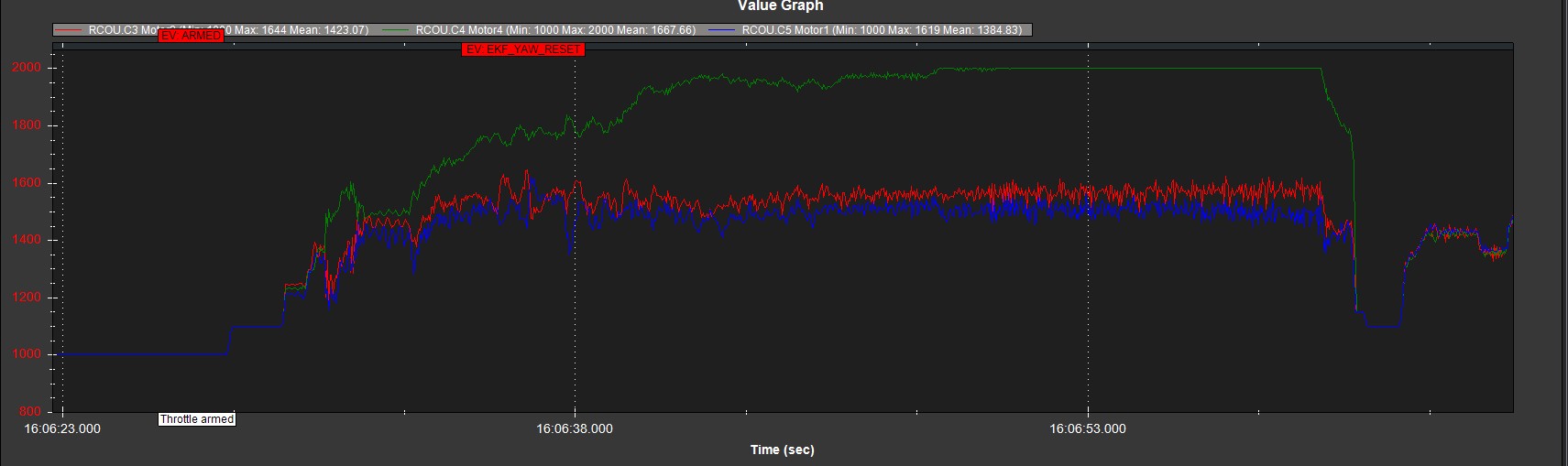 When starting to throttle up, the front motors combined push harder than the back motor, so it tilts back. I believe this may make the two front motors not create sufficient thrust and the back motor too much thrust, which contrains the autopilot and makes it unable to give a lot more throttle to the motors.