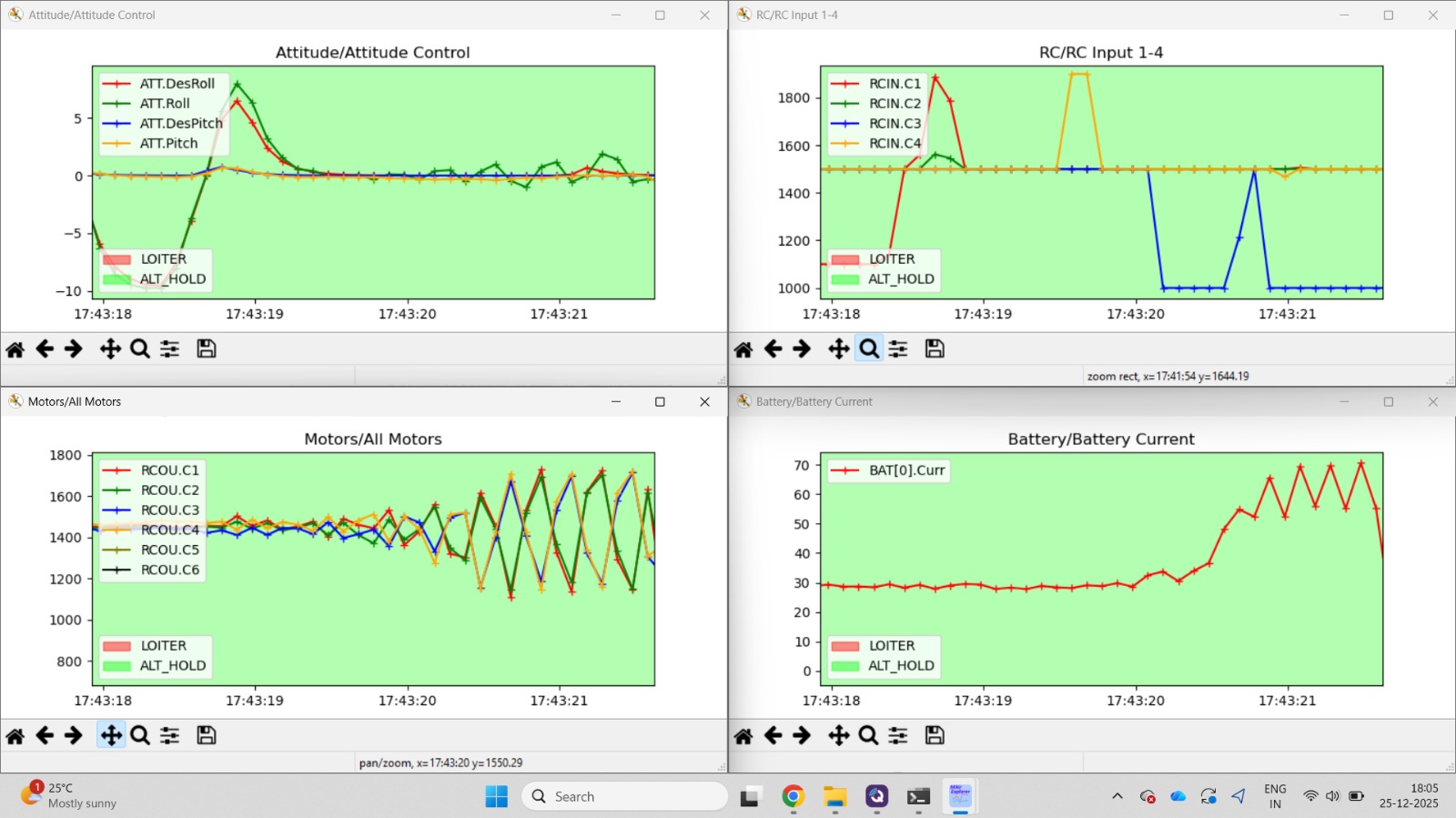 By analyzing the log, I found out after giving yaw input, there was differences in PWM values and sudden spike in current too. I need help analyzing further.